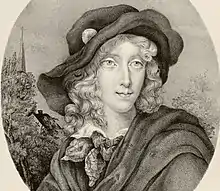 Marie-Caroline de Bourbon-Siciles, duchesse de Berry, déguisée en costume de Petit-Pierre, jeune paysan vendéen (1832), lithographie du XIXe siècle.