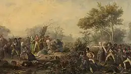 Les premiers troubles dans l'Ouest de la France éclatent en janvier 1791[8] et se multiplient à partir du printemps 1792[3]. En , la Bretagne, le Maine, l'Anjou et le Poitou sont touchés par une vaste insurrection paysanne contre la levée en masse[9]. Au nord de la Loire, les patriotes viennent à bout de la révolte, mais au sud du fleuve les insurgés résistent, entraînant ainsi le début de la guerre de Vendée[9]. Génériquement appelés les « Vendéens » après la bataille de Pont-Charrault, les insurgés du sud de la Loire forment une « Armée catholique et royale » qui remporte plusieurs victoires contre les républicains mais qui finit par être écrasée en à la bataille de Cholet[9]. Acculée sur les bords de la Loire, l'armée vendéenne franchit le fleuve avec l'espoir de relancer l'insurrection en Bretagne et dans le Maine[9]. Lors de cette expédition, appelée la « Virée de Galerne »[9], plusieurs milliers de Bretons et de Mainiots rejoignent l'armée vendéenne où ils constituent un corps qui est appelé la « Petite Vendée »[10]. L'armée vendéenne se porte jusqu'à Granville, en Normandie, mais elle finit par être anéantie à la bataille du Mans et à la bataille de Savenay en [9].