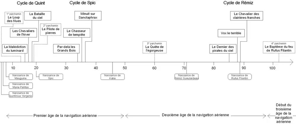 Celle-ci se présente comme un plateau bordé de précipices sans fond. La série couvrant une période de plus de 600 ans, elle se découpe en trois « ères de la navigation aérienne » qui voient chacune leur lot d’innovations et de machines volantes, indispensables dans le monde de la Falaise.