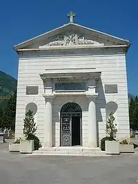 Le 6 mai 1824, le maire reçoit l'autorisation du ministre de la guerre pour la construction de cette chapelle, située alors dans la seconde zone de servitude militaire, à condition de démolir mur de cimetière et chapelle aux frais de la ville à la première réquisition de l'autorité militaire[29],[30]. Le roi Louis XVIII cautionne l'opération en 1824 et la nouvelle chapelle est achevée en 1826 par l'entrepreneur Joseph Gallet. Construite à 290 mètres des remparts de la ville, près du mur d'enceinte du cimetière, elle est au point de convergence des allées principales et visible depuis l'unique entrée du cimetière de l'époque. Elle est en pierre blanche de Sassenage et dotée d’une belle façade classique avec fronton et colonnes. Sur son fronton, sont sculptés les attributs de la mort, un sablier ailé, une torche renversée et une faux. Au-dessus de l'entrée, est gravée l'inscription BEATI QVI IN DOMINO MORIVNTUR (Heureux ceux qui sont morts dans le Seigneur).