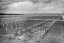 Dix blocs, séparés par l'allée centrale en deux groupes de cinq, forment l'espace dédié aux tombes où reposent les corps de 9 387 personnes[15], dont 307 inconnus et quatre femmes[alpha 2]. Ces personnes sont principalement mortes le jour du débarquement ou dans les semaines suivantes en Normandie, principalement au combat. 14 000 dépouilles, d'abord inhumées en Normandie, ont été rapatriées aux États-Unis, à la demande de leurs proches.