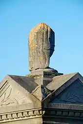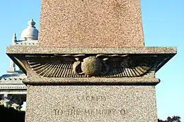 La face orientale de l'obélisque est ornée du symbole du dieu égyptien Horus[P 6] qui surmonte également la porte qui donne accès au caveau du mausolée. Ce symbole est constitué d'un disque solaire ailé encadré de deux cobras[4], le cobra femelle (uræus) ayant dans l'antiquité égyptienne pour fonction de protéger le pharaon contre ses ennemis.