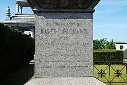 Sous ce symbole est gravée l'épitaphe de Joseph Packard, décédé le 16 août 1888 à l'âge de 69 ans :