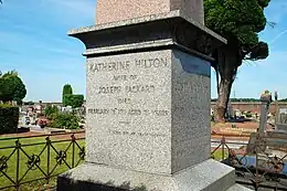 La face sud du monument porte l'épitaphe de son épouse Katherine Hilton, décédé le 12 février 1911 à l'âge de 76 ans :