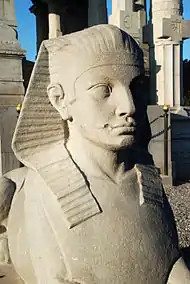 Par son style égyptien, cet obélisque en granit rose sur un socle de granit gris semble répondre au mausolée, dont un des sphinx est couché à ses pieds.