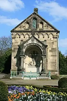 La chapelle du cimetière de l'Est est une copie de la chapelle Saint-Quirin démolie en 1895 qui se trouvait dans le domaine de Melaten devant les tours de la ville, et qui desservait l'ancienne léproserie d'Aix-la-Chapelle. L'on s'est servi des restes de cette ancienne chapelle pour construire celle-ci[3]. Aujourd'hui la partie avant de la chapelle sert de mausolée.