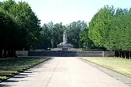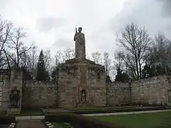 Des deux côtés de l'entrée se trouvent deux groupes sculpturaux de cavaliers. Une allée de tilleuls relie l'entrée à la terrasse principale, et des deux côtés se trouvent des chênaies. Deux escaliers sur les côtés mènent de la terrasse à un parterre géométriquement régulier avec des tombes contenant chacune une dalle de grès.