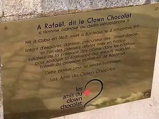 Le 26 janvier 2016, l'association Les amis du clown chocolat inaugure une plaque son souvenir de Rafael, dit Chocolat, à l'entrée du cimetière. Ce dernier, né à Cuba vers 1865 dans une famille d'esclaves africains déportée par les Espagnols, deviendra le premier artiste de scène noir en France. Finissant sa vie dans la pauvreté, il bénéficiera d'une inhumation dans le carré des indigents[28].