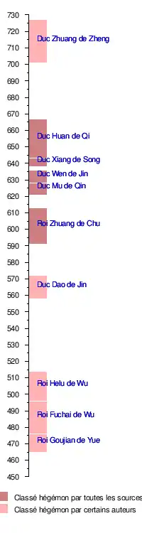 Suivant l'historien ou les textes auxquels on se réfère, il existe plusieurs listes de ces cinq Hégémons, tous dirigeants d'États qui sont nés ou ont gagné en puissance à la suite de la déliquescence du pouvoir central de la dynastie Zhou. Chaque Hégémon a cherché à imposer son pouvoir aux autres états de l'empire Zhou, avec plus ou moins de réussite. Parmi tous ces dirigeants, le Duc Huan de Qi fut un Hégémon particulièrement important.