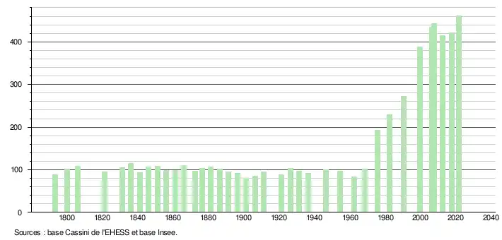 L'évolution du nombre d'habitants est connue à travers les recensements de la population effectués dans la commune depuis 1793. Pour les communes de moins de 10 000 habitants, une enquête de recensement portant sur toute la population est réalisée tous les cinq ans, les populations légales des années intermédiaires étant quant à elles estimées par interpolation ou extrapolation[22]. Pour la commune, le premier recensement exhaustif entrant dans le cadre du nouveau dispositif a été réalisé en 2007[23].