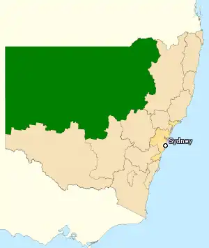 Elle est située au nord de l'État à la frontière avec le Queensland et comprend les villes de Dubbo, Dunedoo, Gunnedah, Moree et Mudgee. Cette circonscription est acquise au parti national