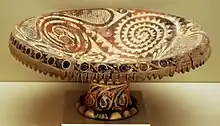 L'exemplaire le plus important d'inscription hiéroglyphique crétoise est le disque de Phaistos, découvert en 1903 dans un dépôt dans les appartements nord-est du palais. Une tablette en linéaire A et de la céramique du début de la période néopalatiale furent découverts en compagnie du disque. Les deux surfaces du disque sont couvertes de hiéroglyphes disposés en spirale, et imprimés dans l'argile pendant qu'elle était encore humide. Les signes forment des groupes, séparés par des lignes verticales, chacun de ces groupes devant représenter un mot. On peut y distinguer quarante-cinq types différents de signes, dont quelques-uns peuvent être identifiés aux hiéroglyphes de la période proto palatiale[55]. Certaines séries de hiéroglyphes reviennent comme des refrains, suggérant un hymne religieux.