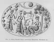 Pour David G. Hogarth, lui-même à l'instigation du concept de « monothéisme dualiste » et reprenant une théorie alors à la mode, les minoens adoraient une déesse-mère polymorphe et souveraine des forces créatrices, accompagnée par un dieu chasseur de moindre importance nommé, faute de mieux, le « jeune dieu ». Pour Martin P. Nilsson, en contradiction totale avec cette construction, la religion minoenne ne pouvait qu'être polythéiste, typée comme les croyances en Méditerranée orientale de l'époque ; il propose une liste de déités telles qu'une déesse domestique aux serpents, une déesse de la fertilité assez proche d'Isthar ou Astarté, une déesse guerrière mycénienne proche de l'Athéna continentale, une déesse à la barque (peut être une prêtresse) et un couple de divins chasseurs, dont la divinité féminine serait à rassembler avec la Potnia Theron, ou Dame des Montagnes et future Artémis, attestée sur les sceaux[63]. À côté de ces divinités principales s'étalerait un cortège de démons, d'animaux fantastiques et de divinités secondaires, comme les dieux guérisseurs du papyrus Ebers, les déesses Ilithyie, Perséphone et Aphaïa, ainsi que des « demi-déesses » humanisées, comme Ariane ou Hélène. Quelques dieux ou proto-dieux grecs masculins issus de la culture minoenne sont connus, notamment Velchanos, Hyakinthos et même Poséidon ou Dionysos, largement hellénisés au premier millénaire avant notre ère.