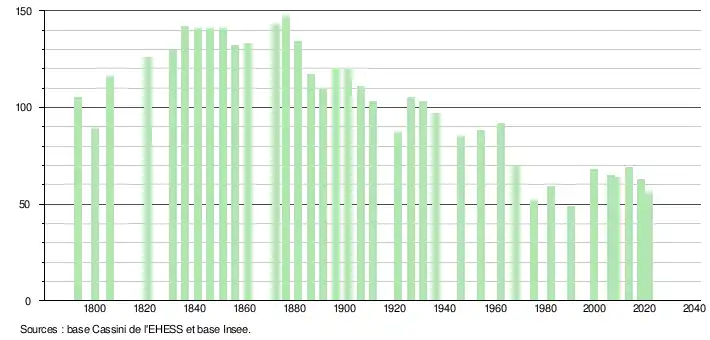 L'évolution du nombre d'habitants est connue à travers les recensements de la population effectués dans la commune depuis 1793. Pour les communes de moins de 10 000 habitants, une enquête de recensement portant sur toute la population est réalisée tous les cinq ans, les populations légales des années intermédiaires étant quant à elles estimées par interpolation ou extrapolation[16]. Pour la commune, le premier recensement exhaustif entrant dans le cadre du nouveau dispositif a été réalisé en 2008[17].
