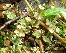 Les Cladonia sont associés à des algues vertes du genre Asterochloris[4]. Ils comportent un thalle primaire encroûtant ou formé d'éléments foliacés (squamules), appliqué sur le substrat. Le thalle primaire peut disparaître ou persister et, dans ce cas, coexister avec le thalle secondaire et éventuellement le dominer.