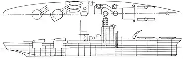 ![]() Le « F » était une tentative pour créer un hybride entre un porte-avion et un cuirassé. Son déplacement de 32 260 tonnes était largement inférieur aux dispositions du traité. Trois catapultes étaient montées à la proue avec un hangar capable d'accueillir dix bombardiers avec ailes repliables. Deux tourelles équipées de canons de 14 pouces non superposées étaient placées à l'arrière[32]. |