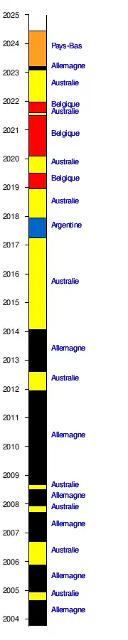 Drapeau de l'Australie Australie 10 (2005, 2010, 2011, 2014, 2015, 2016, 2017, 2019, 2021, 2022)9 (2004, 2006, 2007, 2008, 2009, 2012, 2013, 2018, 2020)1 (2003)