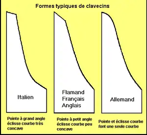 Les descriptions ci-dessous s'appliquent, avec de nombreuses variantes, aux clavecins historiques fabriqués au cours des XVIIe et XVIIIe siècles ainsi qu'aux instruments contemporains dont la facture s'en inspire. Les clavecins dits « modernes », fabriqués au début et pendant la première partie du XXe siècle peuvent avoir des caractéristiques assez différentes[3].