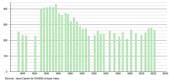 L'évolution du nombre d'habitants est connue à travers les recensements de la population effectués dans la commune depuis 1793. Pour les communes de moins de 10 000 habitants, une enquête de recensement portant sur toute la population est réalisée tous les cinq ans, les populations légales des années intermédiaires étant quant à elles estimées par interpolation ou extrapolation[18]. Pour la commune, le premier recensement exhaustif entrant dans le cadre du nouveau dispositif a été réalisé en 2006[19].