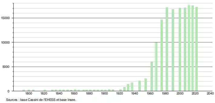 - Par convention dans Wikipédia, le principe a été retenu de n’afficher dans le tableau des recensements et le graphique, pour les populations légales postérieures à 1999, que les populations correspondant à une enquête exhaustive de recensement pour les communes de moins de 10 000 habitants, et que les populations des années 2006, 2011, 2016, etc. pour les communes de plus de 10 000 habitants, ainsi que la dernière population légale publiée par l’Insee pour l'ensemble des communes.
