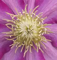 Les étamines de cette clématite sont blanches. Les stigmates sont quant à eux jaunes.