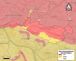 Le retrait-gonflement des sols argileux est susceptible d'engendrer des dommages importants aux bâtiments en cas d’alternance de périodes de sécheresse et de pluie[22]. La totalité de la commune est en aléa moyen ou fort (91,8 % au niveau départemental et 48,5 % au niveau national)[Carte 2]. Depuis le , en application de la loi ELAN, différentes contraintes s'imposent aux vendeurs, maîtres d'ouvrages ou constructeurs de biens situés dans une zone classée en aléa moyen ou fort[Note 4],[23].