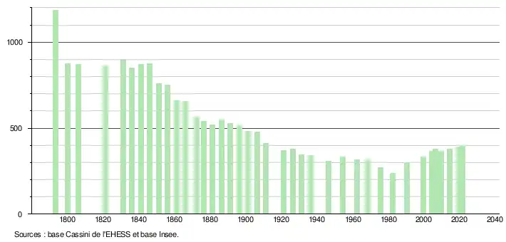 L'évolution du nombre d'habitants est connue à travers les recensements de la population effectués dans la commune depuis 1793. Pour les communes de moins de 10 000 habitants, une enquête de recensement portant sur toute la population est réalisée tous les cinq ans, les populations légales des années intermédiaires étant quant à elles estimées par interpolation ou extrapolation[30]. Pour la commune, le premier recensement exhaustif entrant dans le cadre du nouveau dispositif a été réalisé en 2004[31].