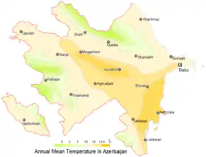 Le régime de température et sa répartition à travers l'Azerbaïdjan sont réguliers et dépendent des caractéristiques des masses d'air entrant dans le pays, du paysage régional et de la proximité de la mer Caspienne[2].