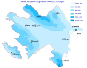 Les précipitations annuelles maximales tombent à Lankaran (1 600 à 1 800 mm) et le minimum dans la péninsule d'Abcheron (200 à 350 mm)[2].
