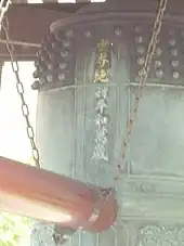 Sur un côté de la cloche une inscription en caractères japonais proclame : « Que vive une paix absolue dans le monde » (世界絶対平和萬歳, sekai zettai heiwa banzai[3],[4]).