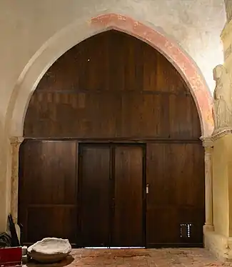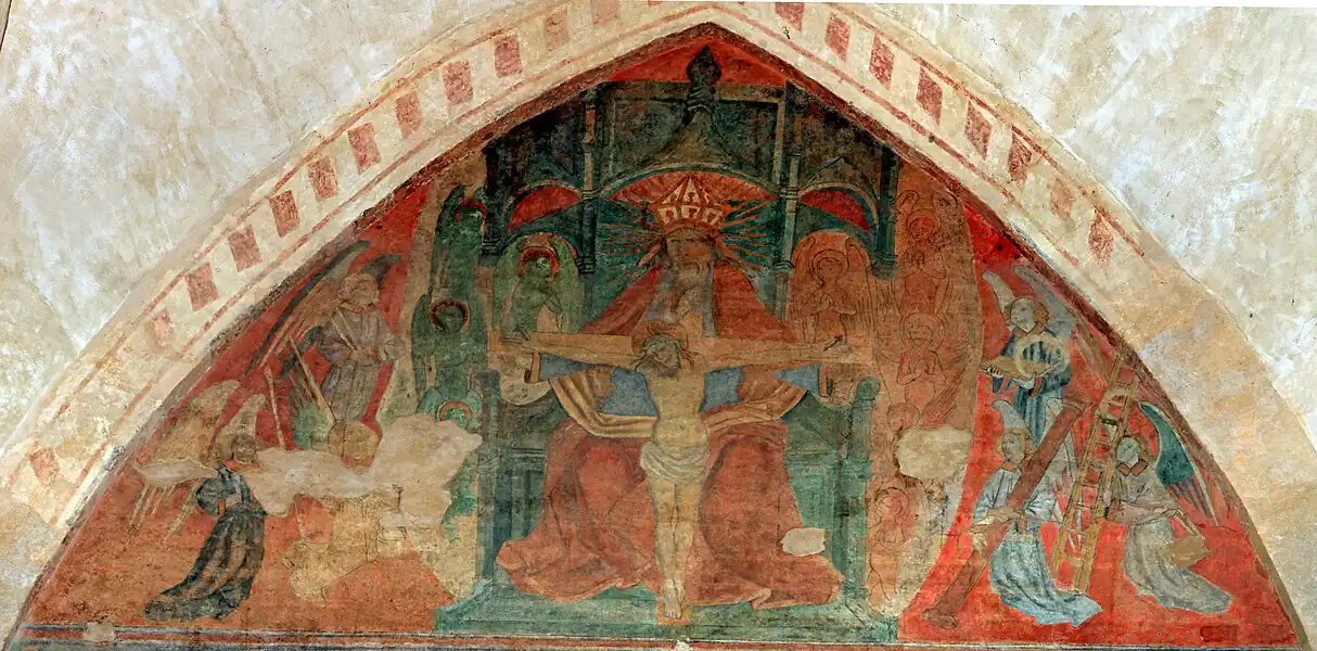 Au-dessus du portail, sous un arc brisé, se déploie un décor peint sur 26 m2 datant de la seconde moitié du XVe siècle, représentant des scènes de la Passion du Christ.