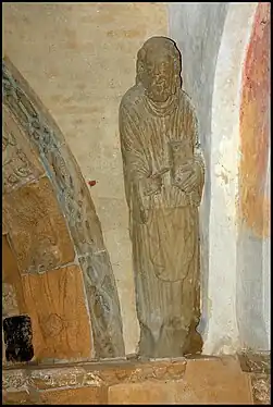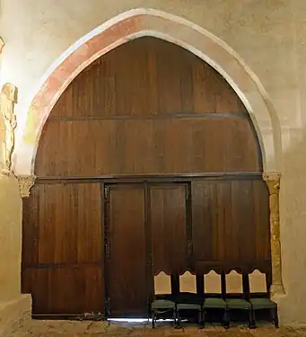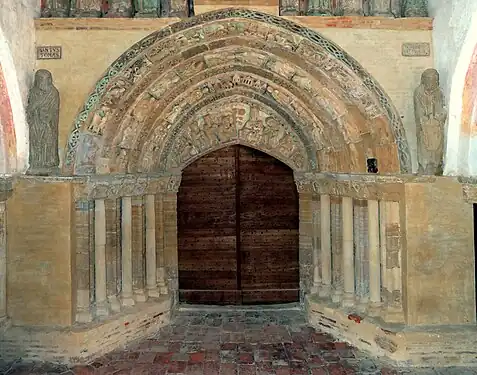Les sculptures du portail et la galerie des apôtres datant des années 1220. Entre la galerie des apôtres et l'arc de la voûte, le mur a été décoré de peintures murales datant des années 1470-1490. L'ensemble du portail sculpté et la galerie des apôtres est classé monument historique en 1903.