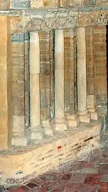 L'arcade ouest qui mesure environ 7 m de hauteur pour une largeur d'environ 3,60 m est constituée d'un soubassement sur lequel repose un pied-droit aménagé dans le mur. Il existe un « pseudo-chapiteau » formé de trois briques en saillie à partir duquel part l'arc brisé.