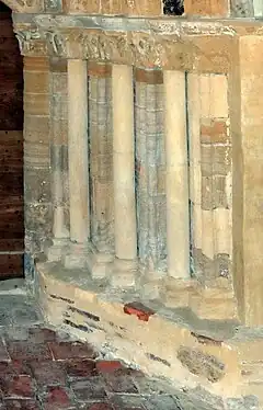 L'ébrasement de la baie comporte trois colonnes et quatre colonnettes alternativement distribuées en fonction de leur rôle structurel. En effet, les colonnes soutiennent les trois voussures proprement dites tandis que les colonnettes sont situées aux retombées des cordons qui séparent les voussures.
