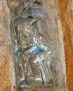 - Saint Guillaume et sa compagne, situés à gauche d'un diagonale qui coup le panneau, sont assez effacés ; le visage féminin a disparu complètement. Ils sont en position de spectateurs de la scène de la Passion ; cette position en fait les portraits des donateurs avec les symboles de leur saint patron. Notons que saint Guillaume est en symétrique avec saint Joseph du tympan, modèle de la paternité.