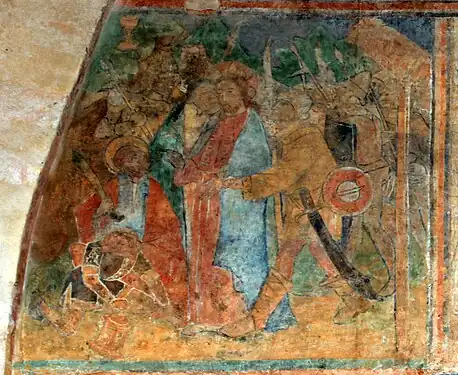 - L'arrestation du Christ se situe dans un paysage montagneux. On y distingue Jésus embrassé par Judas, et arrêtant l'épée de Pierre. Au sol, Malchus (serviteur de Caïphe) a perdu sa lanterne. Un grand soldat, casqué avec épée et bouclier, procède à l'arrestation devant une poterne de bois. Les armes du soldat (épée recourbé, bouclier blanc et rouge, son visage méchant, évoquent le sarrasin type.