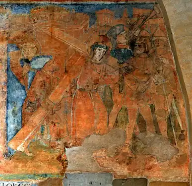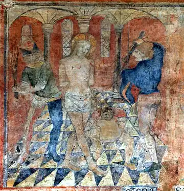 - La flagellation montre autour du Christ trois bourreaux, dont l'un, coiffé d'un chapeau de fou de la cour, porte des chaussures poulaine, et un autre est accroupi pour ramasser de nouvelles verges, lier les jambes de Jésus ou prendre ses vêtements (il y a une lacune important de la fresque).