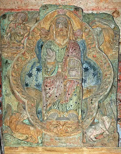 - Trône de grâce montre un Père Éternel barbu coiffé d'une couronne rayonnante et non d'un tiare. Le trône est architecturé, en bois et surmonté d'un dais ovale. Le Père Éternel porte le Christ en croix et entre eux la colombe du Saint-Esprit. Autour de cette vision classique de la Trinité de nombreux anges translucides forment une grande mandorle.Dans les deux écoinçons, de grands anges portent les instruments de la Passion.