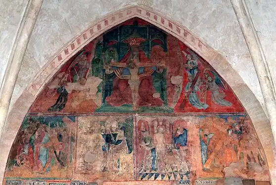 Sur la partie supérieure du mur, on trouve des peintures murales qui s'étendent sur une superficie de 26 m2 et représentent des scènes de la Passion du Christ. Elles sont datées du XVe siècle, autour des années 1460. Cette datation est possible, entre autres, grâce à l'emploi de la perspective et des habits des bourreaux dans la scène de la flagellation du Christ.