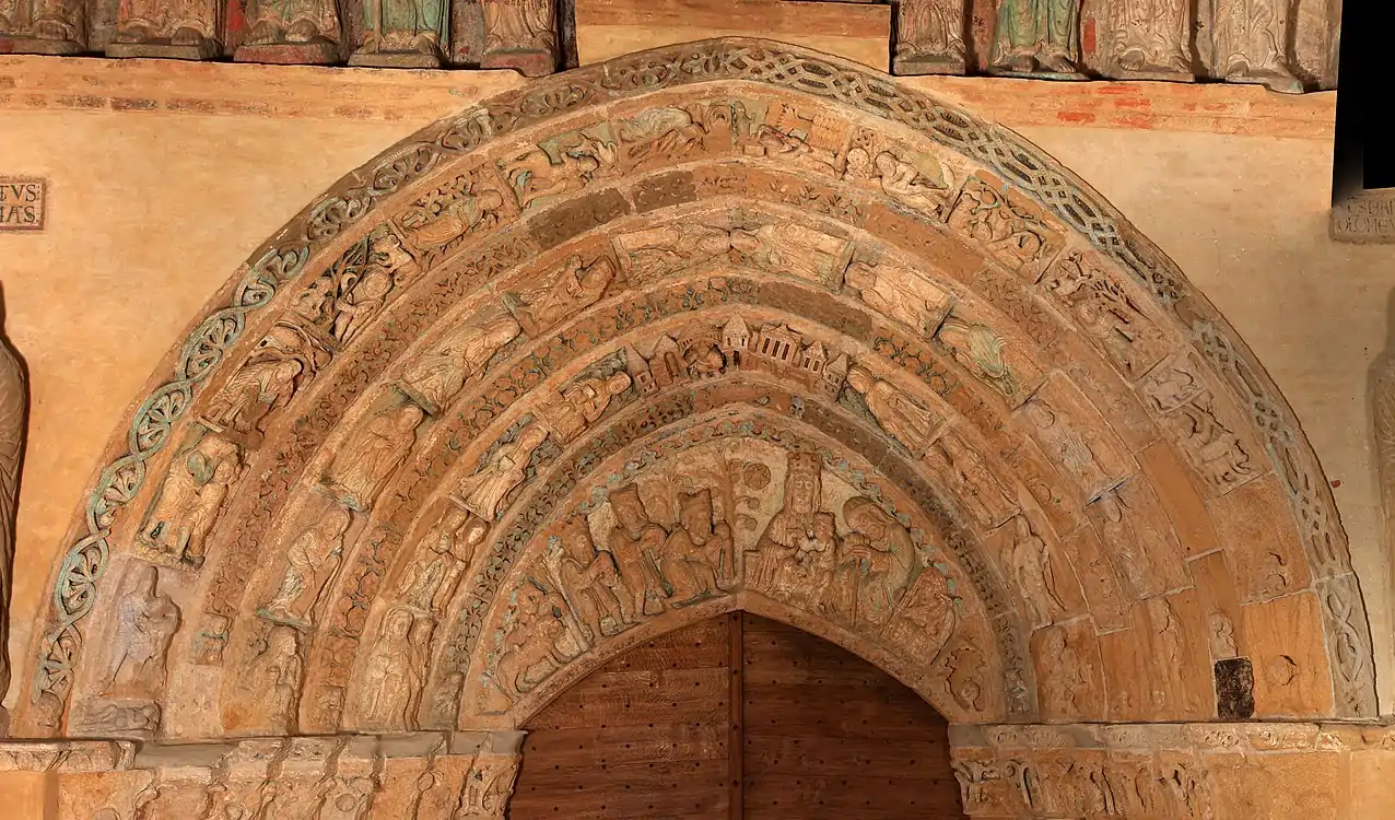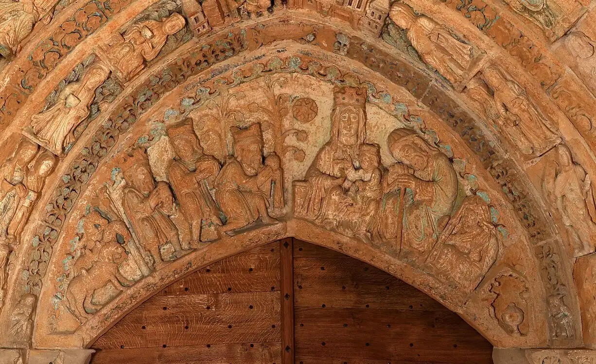La scène sculptée sur le tympan, dont la forme en croissant est unique en France, représente l'adoration des rois mages.