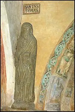 Deux autres apôtres sont identifiables : saint Pierre grâce à ses clefs, et saint Paul grâce à son glaive[Note 3]. Les autres apôtres ne sont pas identifiables par leurs attributs traditionnels mais par les noms peints sur le mur.