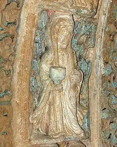 - Un calice, celui que Jésus a accepté dans sa prière au Jardin des Oliviers, est situé dans la partie supérieure du panneau. Il est situé sur un diagonale qui le met en parallèle avec la cuve baptismale du tympan. On peut y voir une intention théologique : le baptême chrétien procède de la Passion et la Résurrection, le baptême de Jésus au Jourdain en est une simple préfiguration.