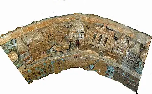- La voussure interne représente les Vierges Sages et Vierges Folles[Note 2], de part et d’autre de la Jérusalem céleste,