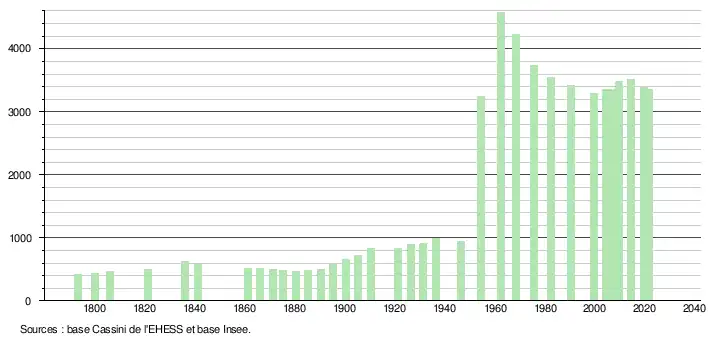 L'évolution du nombre d'habitants est connue à travers les recensements de la population effectués dans la commune depuis 1793. Pour les communes de moins de 10 000 habitants, une enquête de recensement portant sur toute la population est réalisée tous les cinq ans, les populations légales des années intermédiaires étant quant à elles estimées par interpolation ou extrapolation[25]. Pour la commune, le premier recensement exhaustif entrant dans le cadre du nouveau dispositif a été réalisé en 2004[26].
