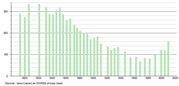 L'évolution du nombre d'habitants est connue à travers les recensements de la population effectués dans la commune depuis 1793. À partir du , les populations légales des communes sont publiées annuellement dans le cadre d'un recensement qui repose désormais sur une collecte d'information annuelle, concernant successivement tous les territoires communaux au cours d'une période de cinq ans. Pour les communes de moins de 10 000 habitants, une enquête de recensement portant sur toute la population est réalisée tous les cinq ans, les populations légales des années intermédiaires étant quant à elles estimées par interpolation ou extrapolation[2]. Pour la commune, le premier recensement exhaustif entrant dans le cadre du nouveau dispositif a été réalisé en 2004[3],[Note 1].