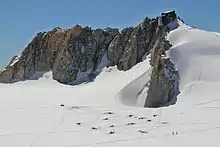 |   Vue depuis l'aiguille du Midi du col du Midi dominé par le mont Blanc du Tacul ; le refuge des Cosmiques est visible sur les rochers dans le bas de l'image. | ||||