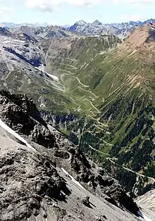 Vue du col du Stelvio depuis le piz da las Trais Linguas.