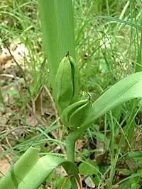 - au printemps, ce sont les feuilles lancéolées, larges qui apparaissent entourant le fruit, une grosse capsule ovoïde formée d'abord sous terre.