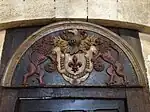 Le panneau cintré en bois portant un décor sculpté en haut-relief, situé à l'entrée de la collégiale et représentant les armes de M. de Tilly, marquis de Blaru, bienfaiteur de la Charité, devait figurer au-dessus de la porte de la chambre de charité, détruite au début du XXe siècle.