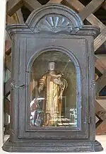 Saint Vincent - Statuette de la confrérie des vignerons fondée à Vesoul en 1597, niche votive (1769) | n.c. | n.c. | Bois doré polychromé, bois de chêne | h. 56 cm | Don de la Confrérie des vignerons de Vesoul en 1986 (Prov. église Saint-Georges à Vesoul) | Salle Beauchamp | [1] |